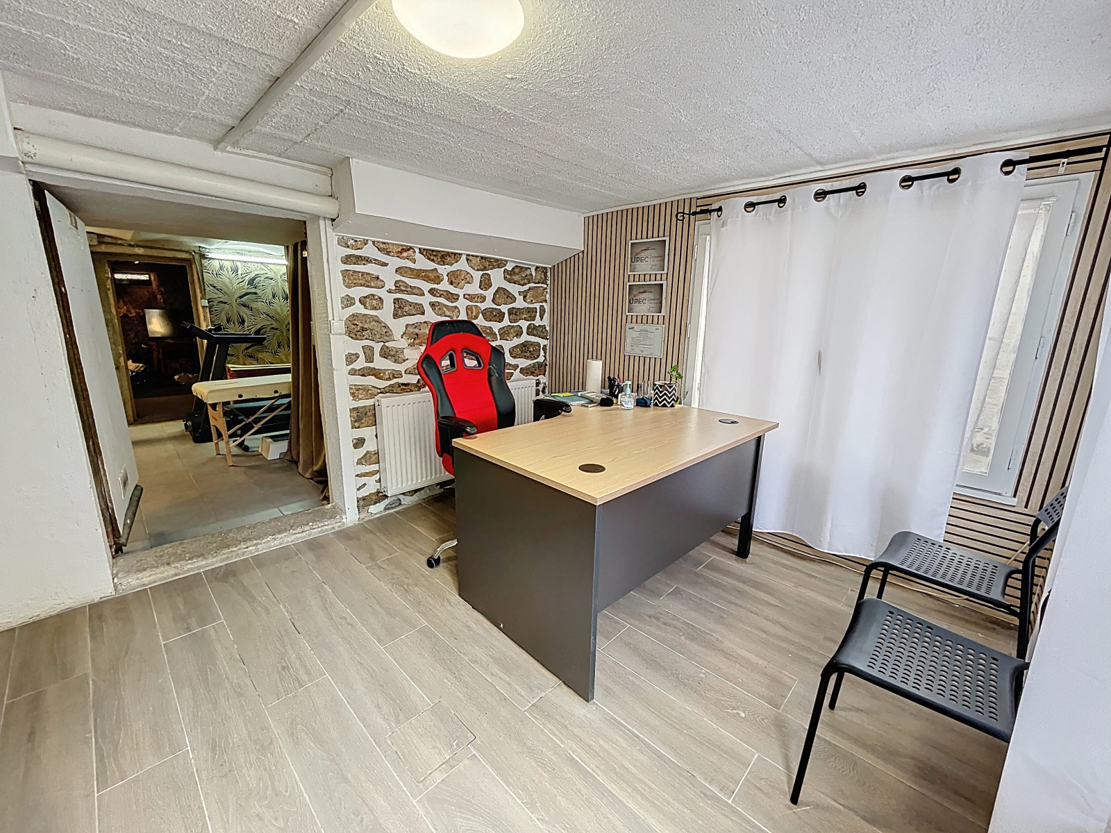 Le sous-sol constitue un véritable atout : il comprend une cave, une salle de sport avec WC, ainsi qu’un bureau lumineux avec fenêtres et chauffage, bénéficiant d’un accès direct au jardin. Cet espace offre de nombreuses possibilités, idéal pour une activité professionnelle, un espace indépendant ou un futur studio.